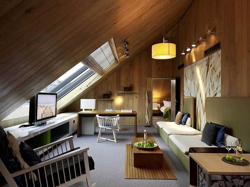 В подкровельных помещениях нужно тщательно продумать дизайн обшивки. Кроме того, потребуется установка особых мансардных окон. Они обойдутся дороже обычных стеклопакетов. И ещё один важный момент – обшивка не должна оказывать особой нагрузки на стены. Специалисты советуют подбирать лёгкие виды покрытий.