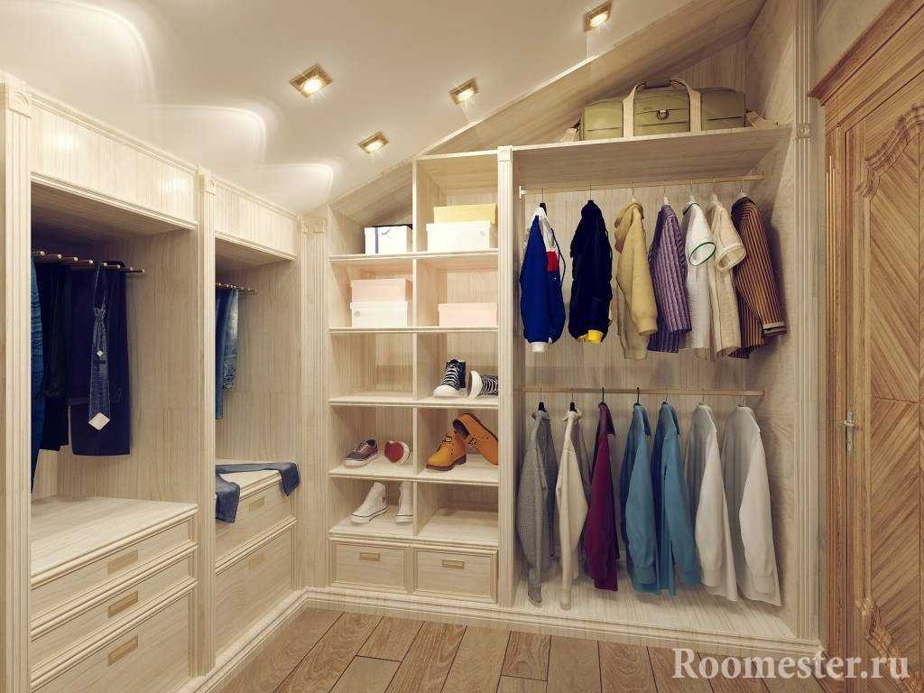 У высоких стен устанавливаются шкафы и ниши для длинных вещей. Возле стен под уклоном хорошо впишется гардероб с раздвижными дверями. Рядом с низкими фрагментами стены можно оборудовать невысокие тумбы, скамейки, на которые удобно присесть, хранить там сезонные вещи, обувь с пылесосом.