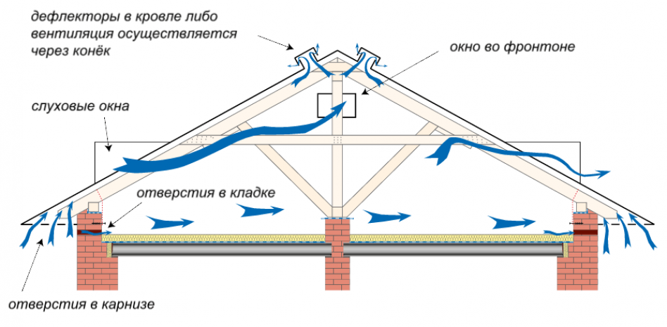 Еще одной особенностью утепления является организация вентиляции на чердаке. Для этого предусматривают специальные вентиляционные отверстия. Их суммарная площадь должна составлять 0,2-0,5% от всего кровельного покрытия.