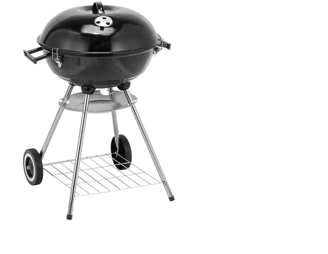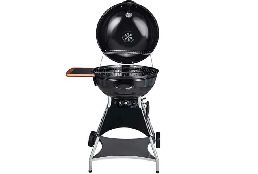 Довольно компактная модель круглой формы диаметром 57 сантиметров имеет классический для американских грилей внешний вид. Гриль удобно перемещать благодаря наличию в его конструкции двух пластиковых колесиков. Устройство надежно стоит на ровной поверхности за счет упора на третью ножку со специальным нескользящим наконечником. На крышке присутствует нейлоновая, покрытая стекловолокном ручка, устойчивая к высоким температурам и не нагревающаяся под их воздействием. Примерно такую же ручку можно заметить и на корпусе устройства.