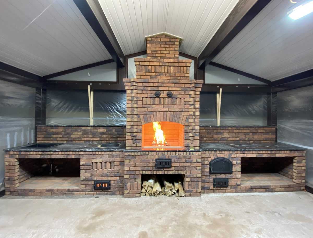 Для удобства использования предусмотрена каменная столешница и отдельная столешница с мойкой. Дымоход с вытяжкой обеспечивает чистоту воздуха.