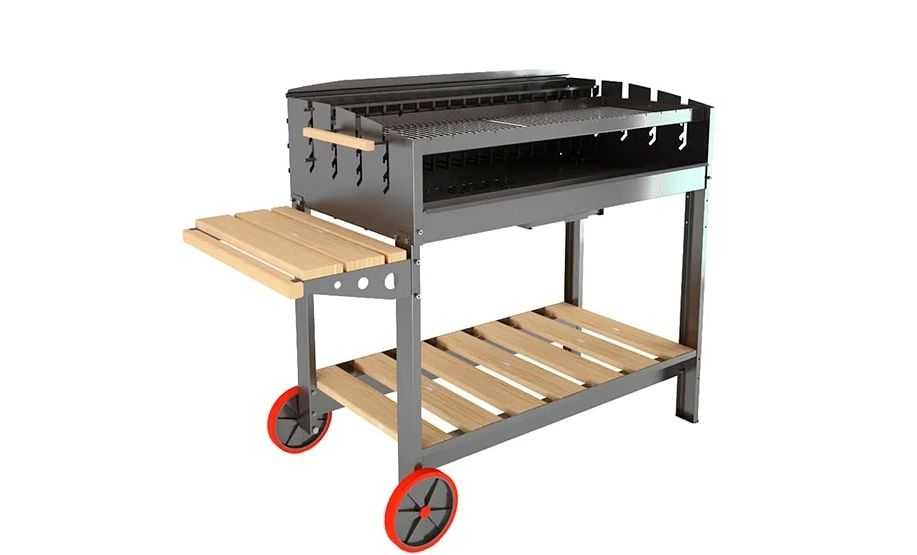 Продолжает наш рейтинг гриль на дровах Grillux Orion 100, обладающий специальной конструкцией, благодаря которой можно регулировать высоту расположения решетки для шампуров и мангала. Для комфортной транспортировки изделия есть два колеса. Для изготовления корпуса применяется долговечная и высококачественная сталь, не подверженная процессу коррозии, деформации и быстрому износу. Модель оснащена специальной металлической жаровней, которая предназначена для сжигания дров и получения углей. На полку из древесины можно положить маринад, тарелку с едой или шампуры. Две передних ножки обеспечивают устойчивость гриля на любой поверхности. Компактный размер отвечает за удобство при хранении модели в условиях ограниченного пространства.