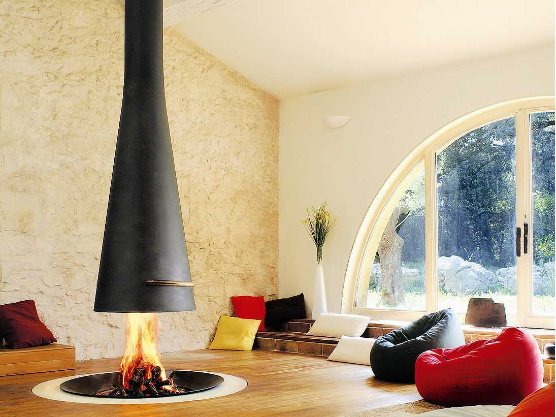 Если же помещение оформлено в лофт или футуристическом стиле, то можно выбрать оригинальное и довольно необычное размещение камина на потолке. Для такого оформления стоит выбирать электрокамины.