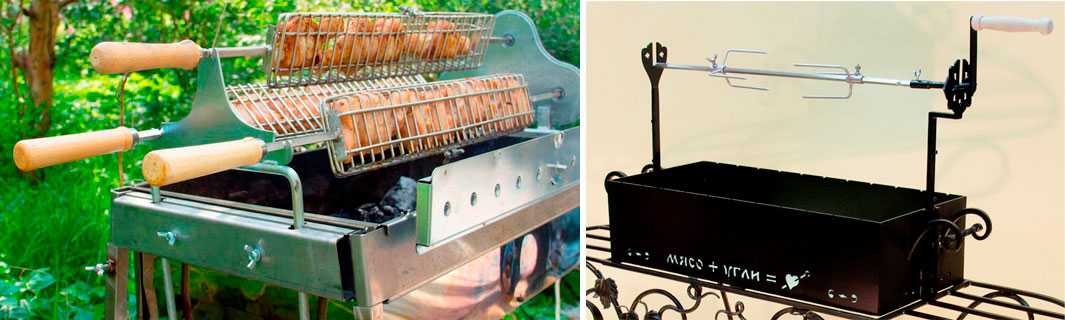 На небольшом, самом универсальном стержне, рассчитанном на 10 кг, можно приготовить несколько тушек курицы, молочного поросенка или ягненка. Приспособление располагают вдоль короба.