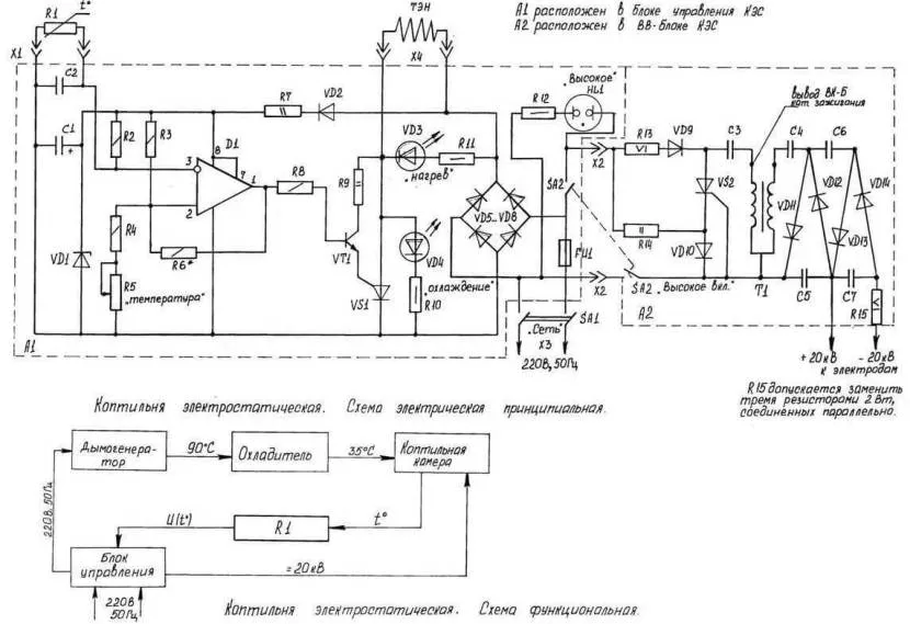 В верхней части коптильни на керамических изоляторах установлена решетка, на которую одевается подвеска с продуктами. К решетке подключается отрицательный электрод электростатического генератора. Вдоль стенок коптильни укладывается ватман с наклеенной проволокой, это положительный электрод. На проволоке припаяны заостренные отрезки из той же проволоки, они направляют поток заряженных молекул в сторону продуктов.