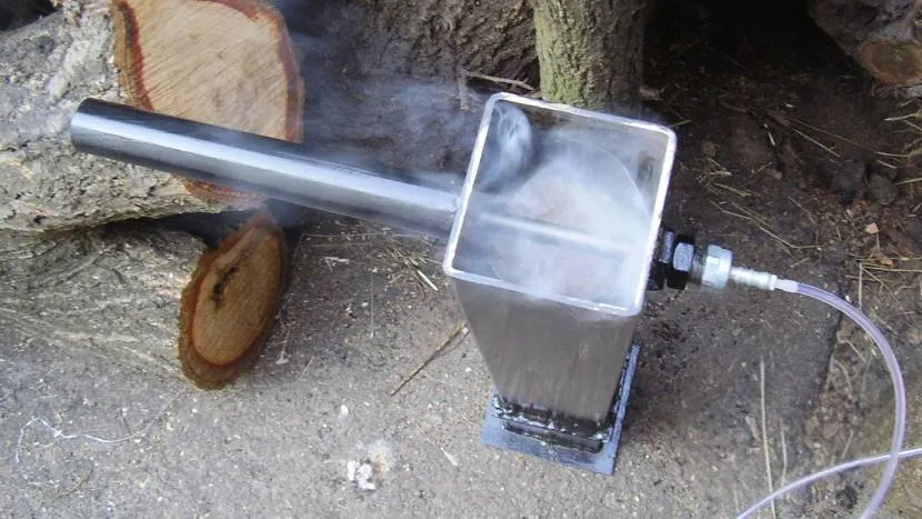 Подойдет самая простая конструкция, работающая на опилках или щепе. И единственно что нужно сделать, это обеспечить быстрое охлаждение дымового потока. Этот вопрос решается двумя способами. Первый требует удлинения дымохода от генератора к камере. Для квартиры он очень неудобен.