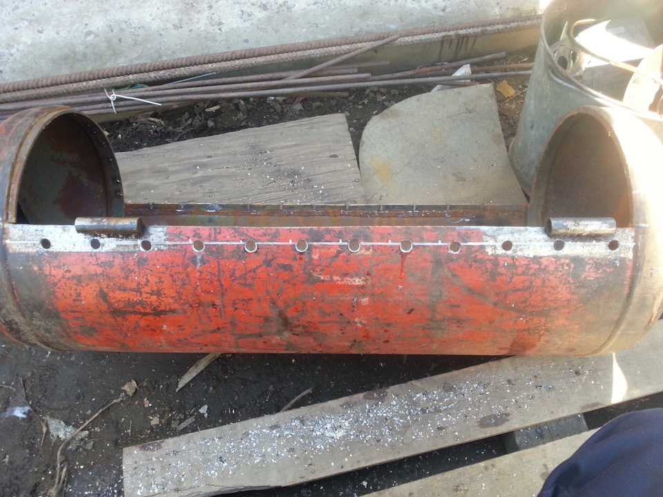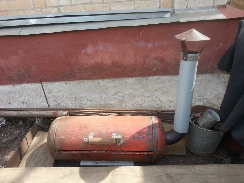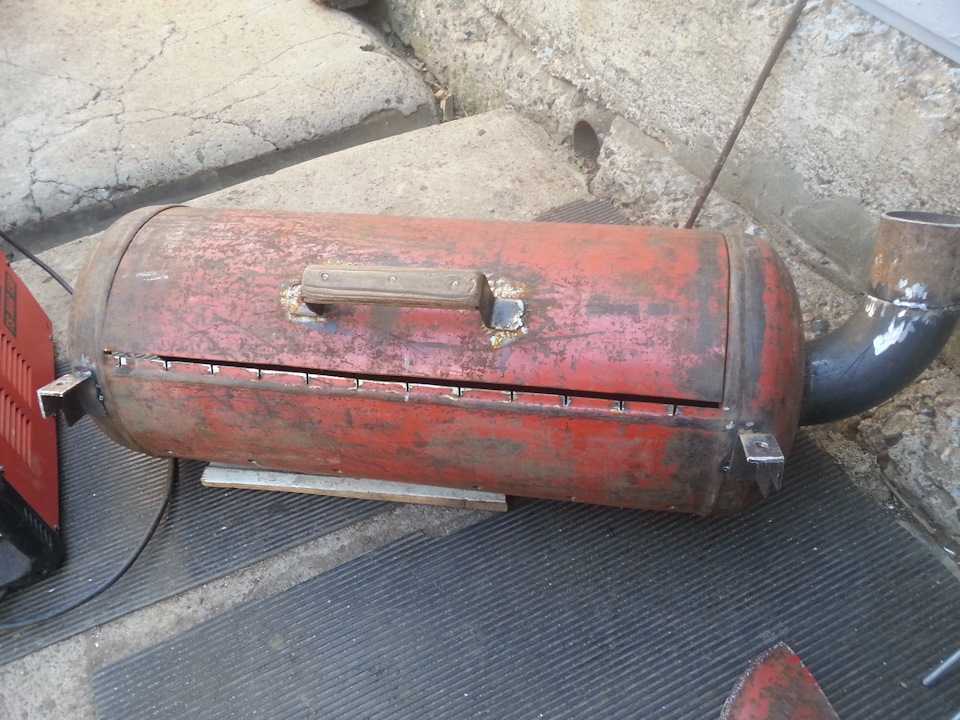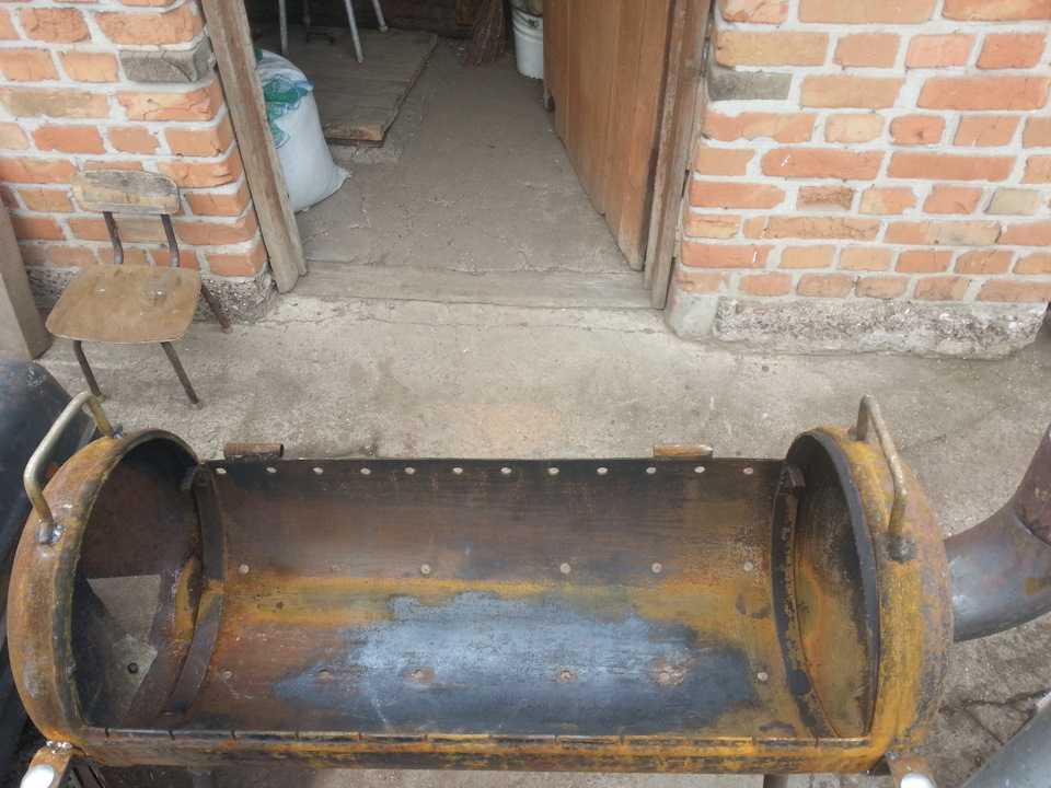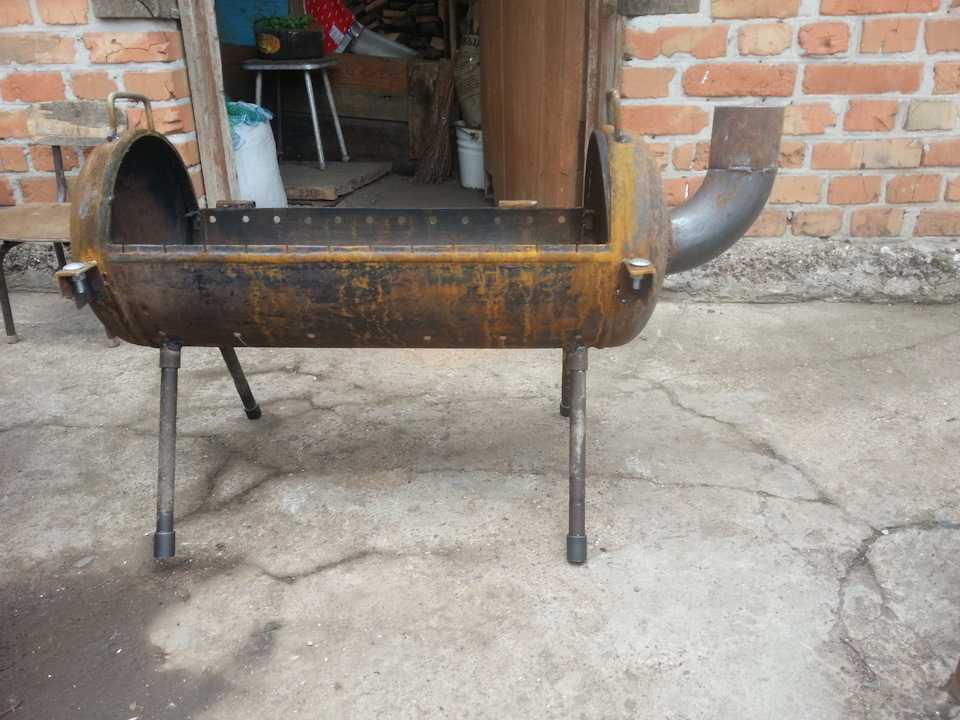 Делается она, так же как и мангал, но только к ней добавляется топка, которую изготавливают из железного листа или небольшого газового баллона. Для этого часть днища мангала спиливают и приваривают к нему топку.