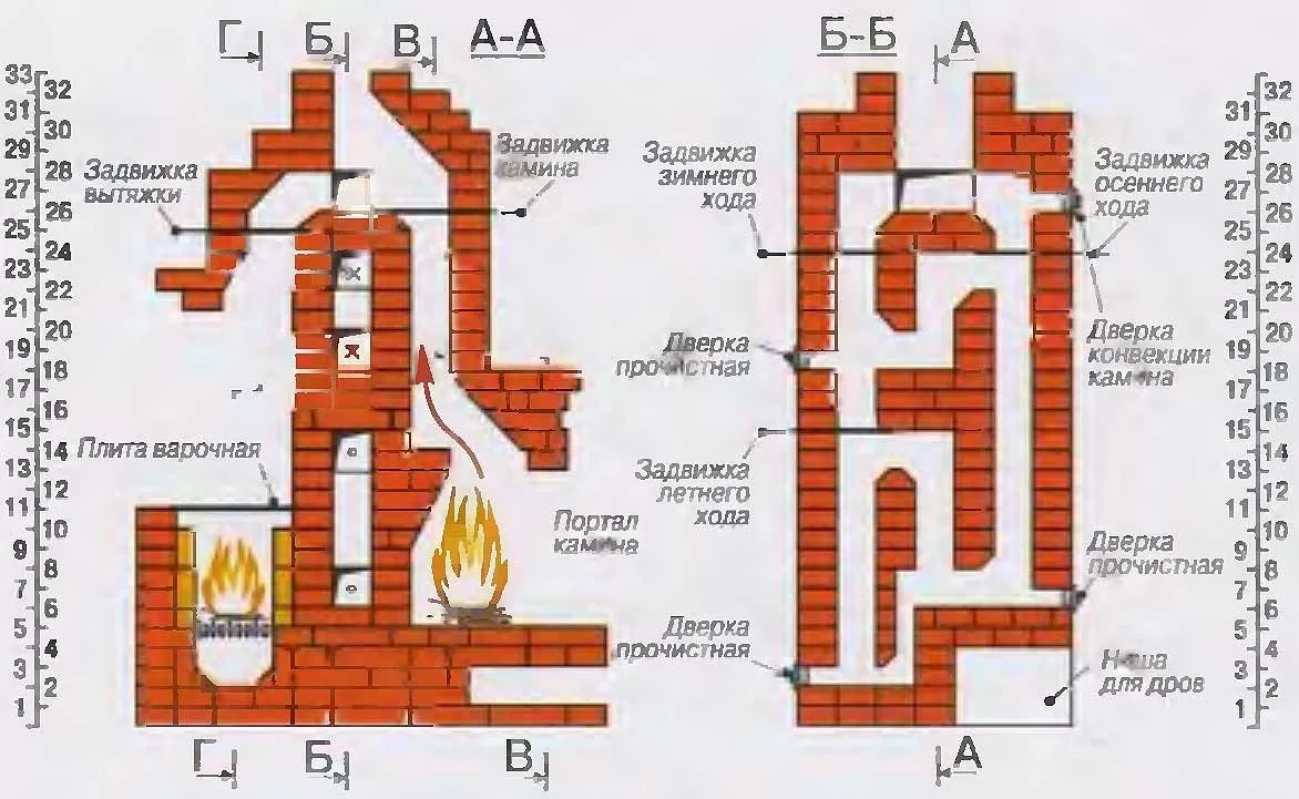 - со 2-го по 5-й — кладут поддувала обоих топливников и устанавливают их дверцы;