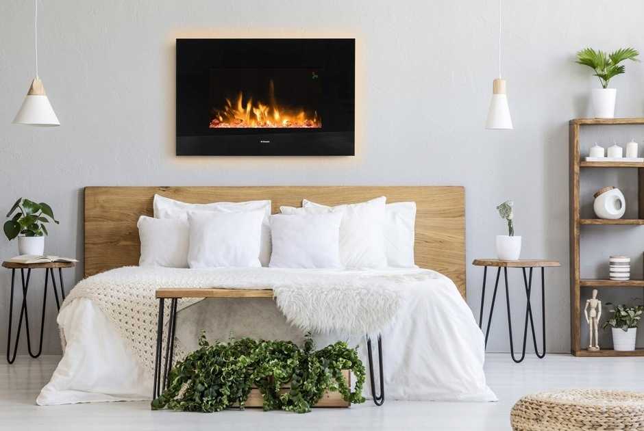 Настенный камин с мощностью 1,8 кВт и дистанционным управлением.