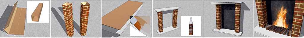 Сделать полку и под камина из коробок можно тоже картонными, но, увы, надолго их не хватит – от перепадов температуры и влажности тонкие клееные из картона детали скоро покоробятся. Выход – склеить ПВА полку и под камина в виде 3-слойных пирогов из картонных обкладок с плитами пенопласта между ними.