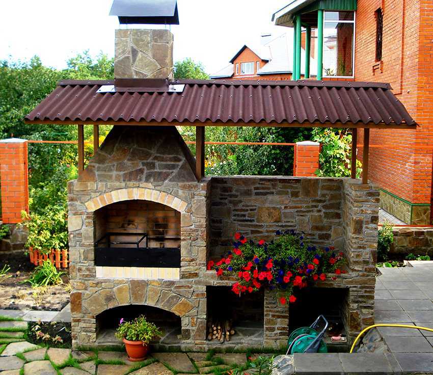 - Зона отдыха и барбекю. Кровля на кирпичных опорах.
