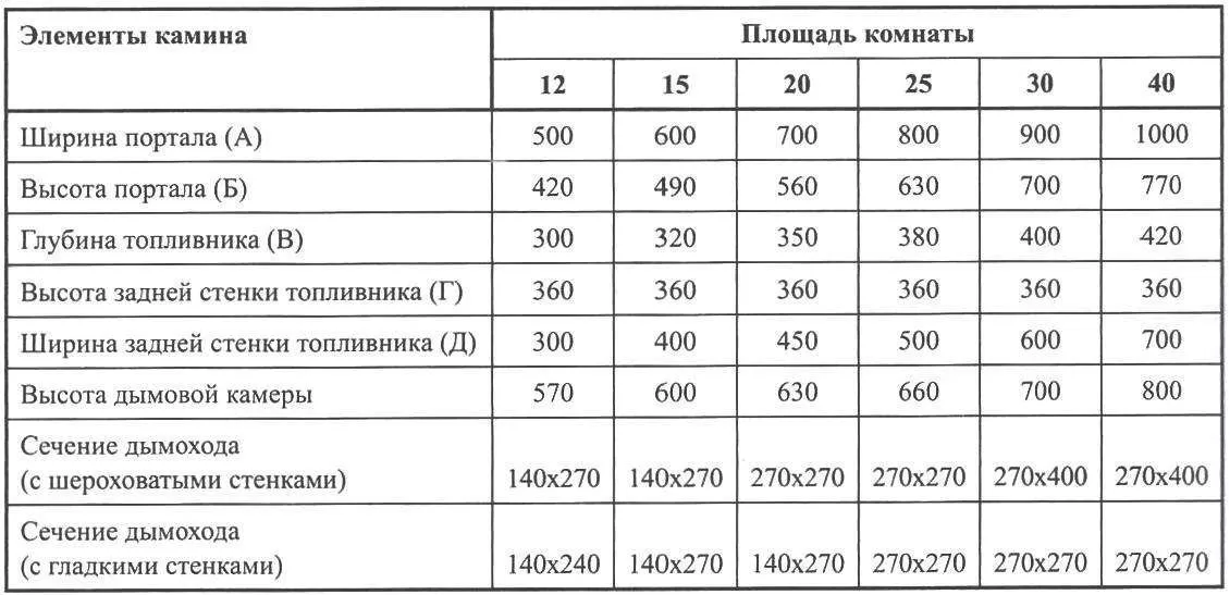 Зависимость размера камина от площади комнаты (мм) на (м2)