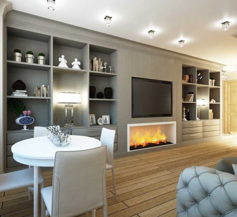 При этом каминную зону отдыха следует располагать у окна. Встроенный камин в гостиной вполне компактный и идеально разделяет пространство помещения. Доминирующим цветом в таком помещении можно выбрать один из оттенков молочного цвета.