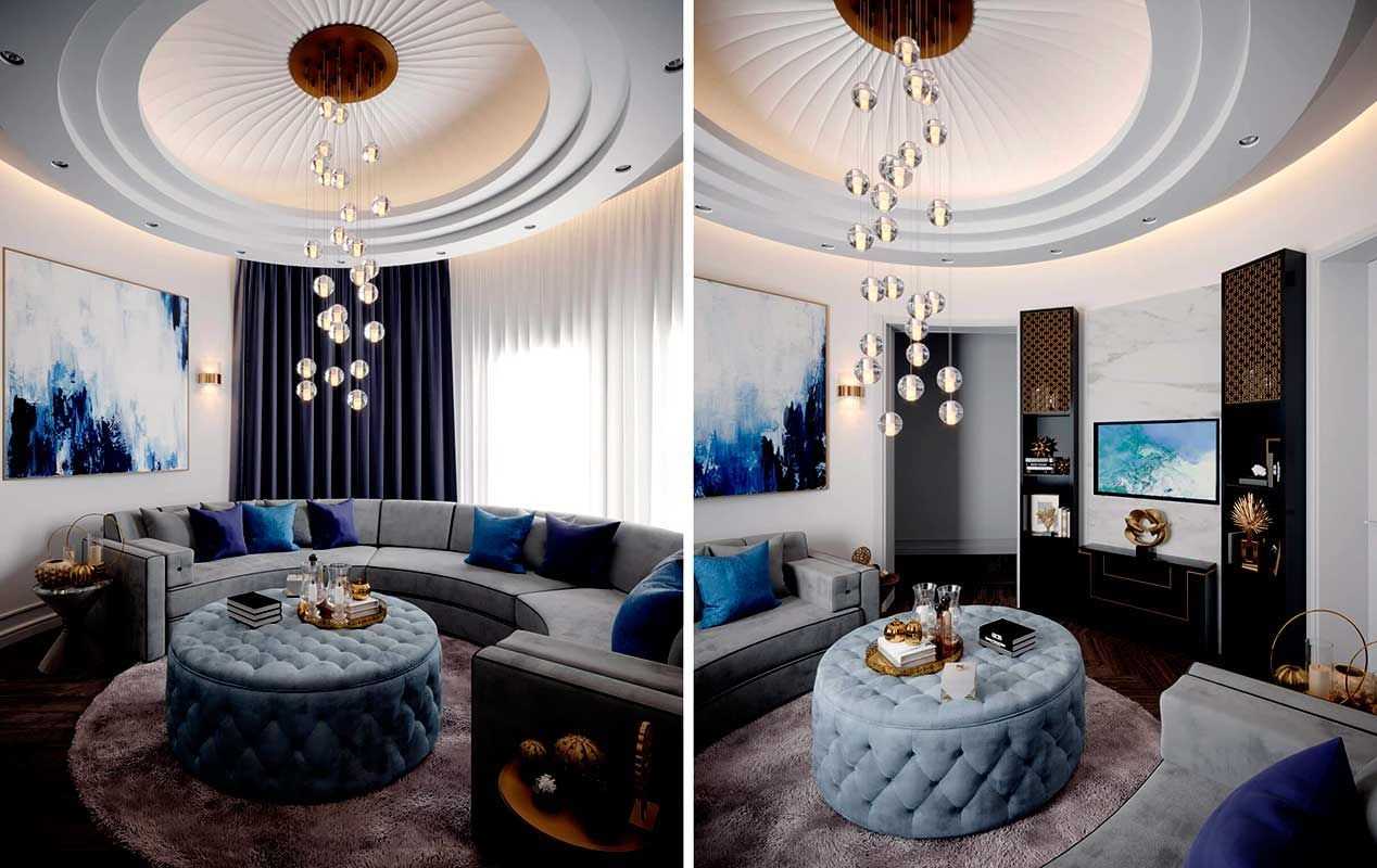 Дизайнер сумел создать атмосферу роскоши достаточно простыми приёмами: чёткие правильные линии, сдержанные тона, куполообразный потолок. Множество деталей в интерьере подчёркивает круглую форму комнаты. Во-первых, сферический потолок, явно обозначающий центр. Во-вторых, современный полукруглый диван, стоящий вдоль окна напротив телевизора.