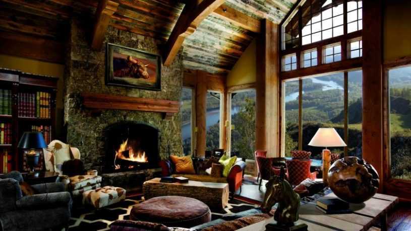 Достаточно часто гостиная в загородном доме совмещает функции столовой и украшением служит рабочий камин на дровах. Это распространенный случай, когда необходимо просторное помещение гостиной – столовой с камином визуально разделить на функциональные зоны.