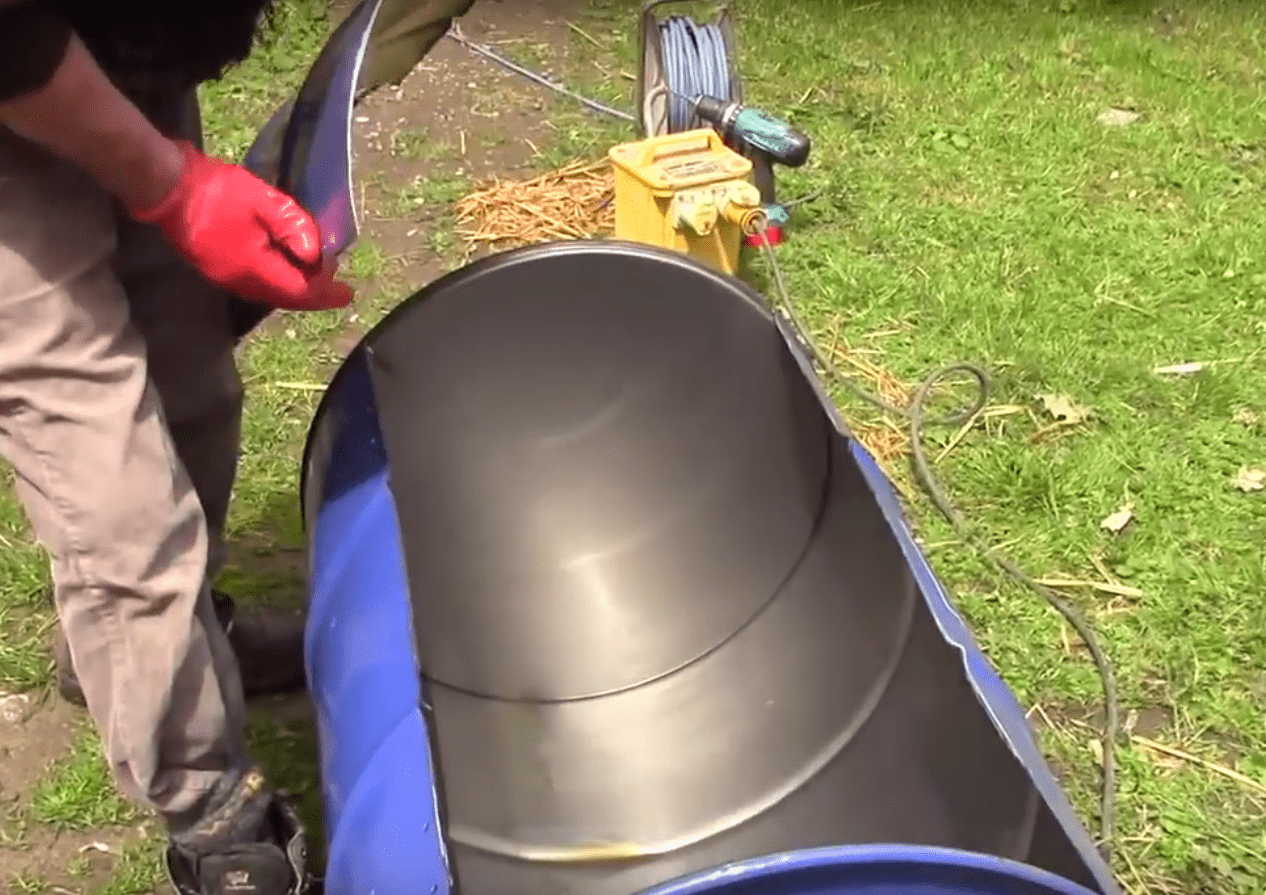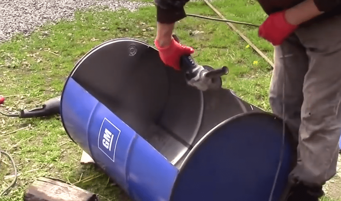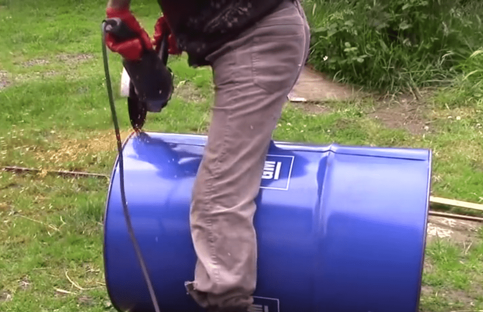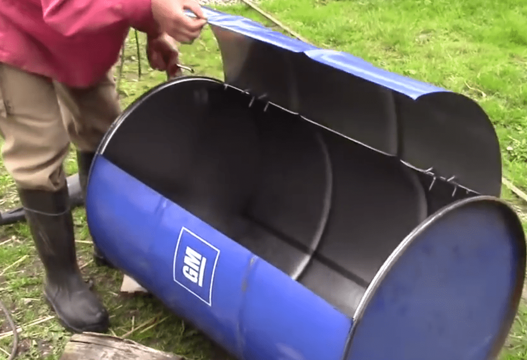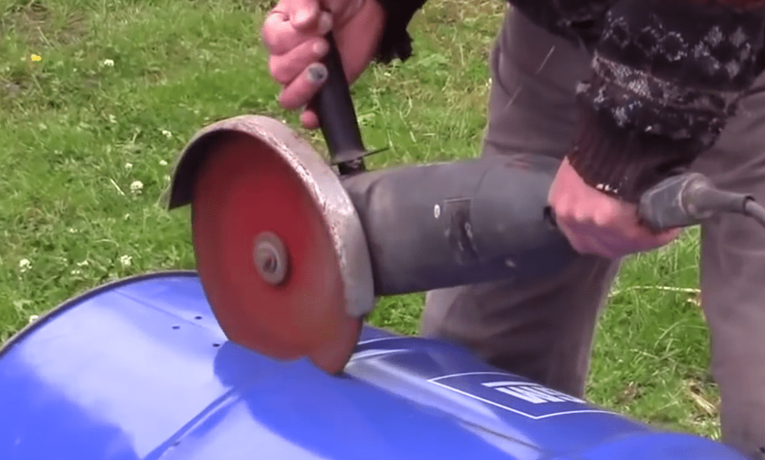 - Затем предстоит повозиться с главным конструкционным элементом – бочкой, которую следует разрезать одним из двух способов: а) вырезать меньшую часть бочки, которой предстоит стать крышкой; б) разрезать бочку точно пополам в случае выбора иной конструкции.