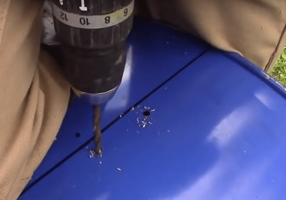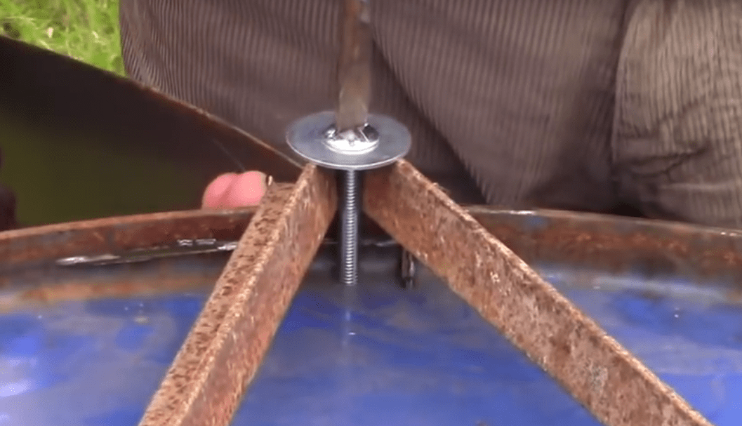 Чтобы прикрепить ножки к бочке укладываем как показано на фотографии и просверливаем 8 мм сверлом 3 дырки. Одна сверху и две по бокам барбекю. Не забывайте, у вас должны быть 8 мм болты.
