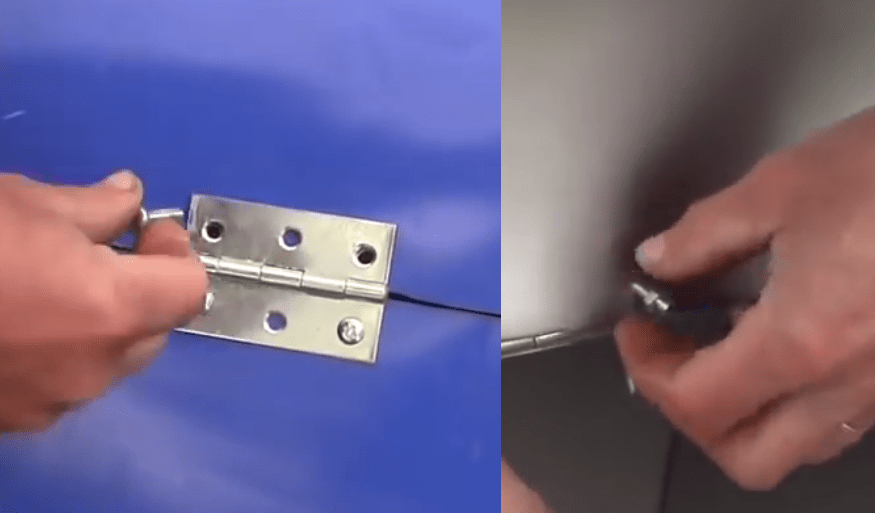 Следующим шагом вставим шурупы с гайками в петли в заранее подготовленные отверстия, чтобы крышка могла открываться и закрываться. Фиксация показана на фотографии.