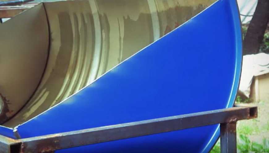 Промывка бочки. Перед тем как распиливать бочку нужно удалить из нее остатки растворителя, чтобы не произошло взрыва. Для этого наливаем полную бочку воды, и сразу выливаем. После этого рекомендуется оставить бочку на солнце, чтобы дать возможность остаткам паров растворителя покинуть ее.