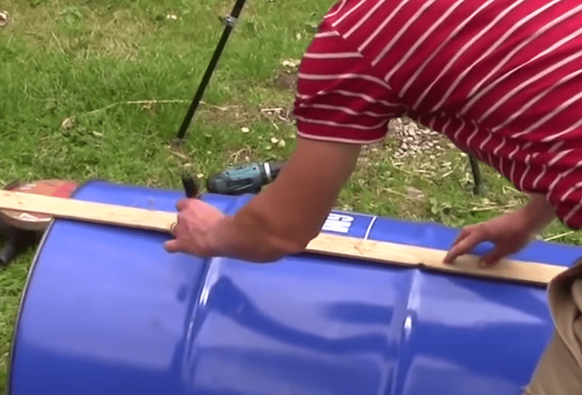 Теперь перейдем непосредственно к сооружению гриля. Чертеж мангала из металла с размерами в данном случае не понадобится, так как ничего сложного в монтаже такой конструкции нет. Технология такая же, как и в случае постройки барбекю гриль на колесах. Берем металлическую бочку и делаем разметку с помощью длинной линейки либо доски, как показано на фотографии.