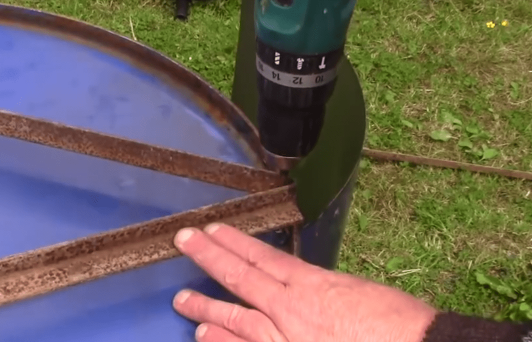 - Обрезанные края бочки нужно обрамить стальным уголком, приварив его или закрепив шурупами. То же делается со второй половиной бочки, если она будет служить крышкой.