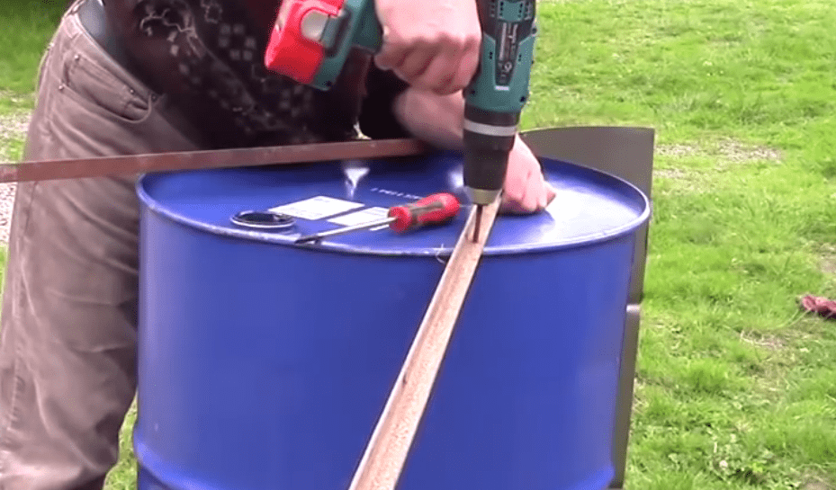 Чтобы сделать ручку берем небольшой брусок, загоняем в него два самореза с двух концов. Также просверливаем два отверстия в крышке. Далее ручка с саморезами с помощью винтов и шайб крепится к крышке бочки. Размеры можно сделать на глаз. Если на глаз не можете – возьмите 170 мм расстояние между отверстиями. Теперь осталось сделать только сетку, и гриль-барбекю из бочки своими руками будет готово!
