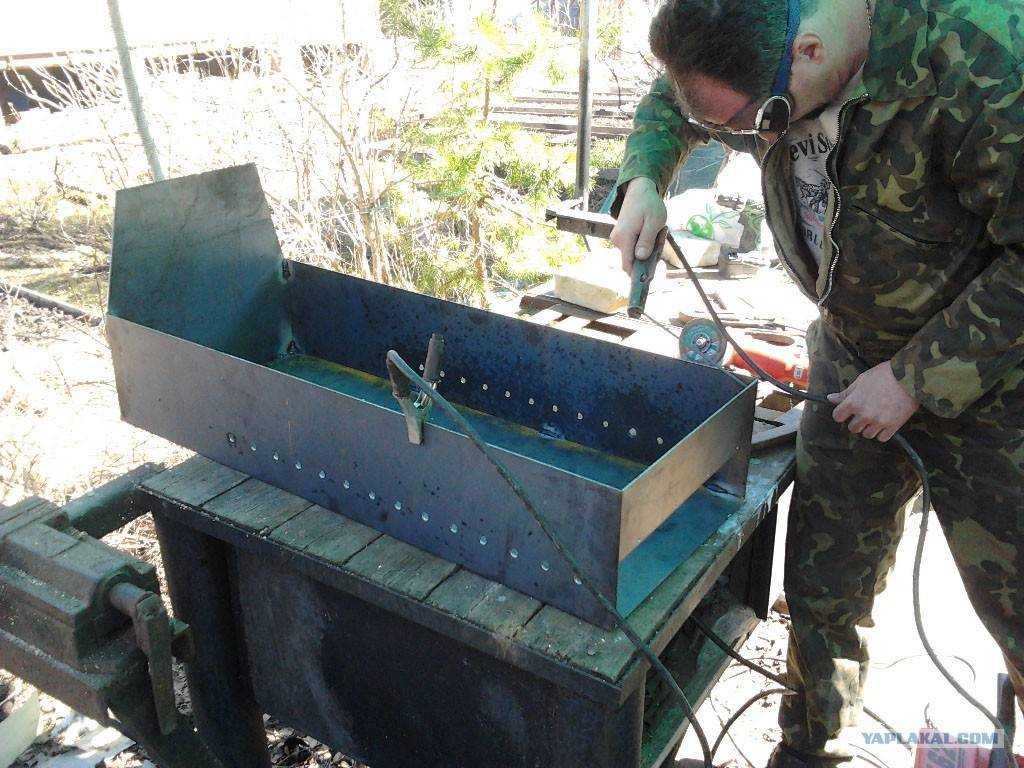 - Из листового металла болгаркой вырезаются две одинаковые пластины на корпус устройства. Размеры индивидуальны под параметры барбекю.