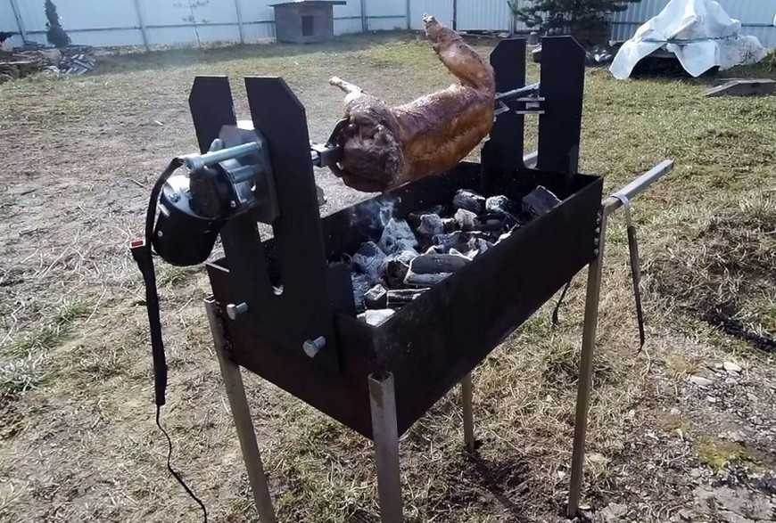 Сделать свой отдых на природе комфортным можно за счет мангала с электроприводом шампуров. Он приобретается в готовом виде или делается самостоятельно. Для этого в жаровне нужно устроить электропривод, выполняющий механическую работу вместо повара. Останется только вовремя убрать мясо с огня, чтоб она не сгорело.