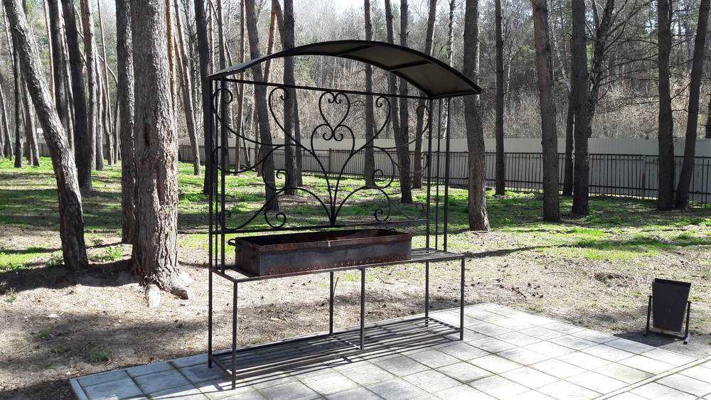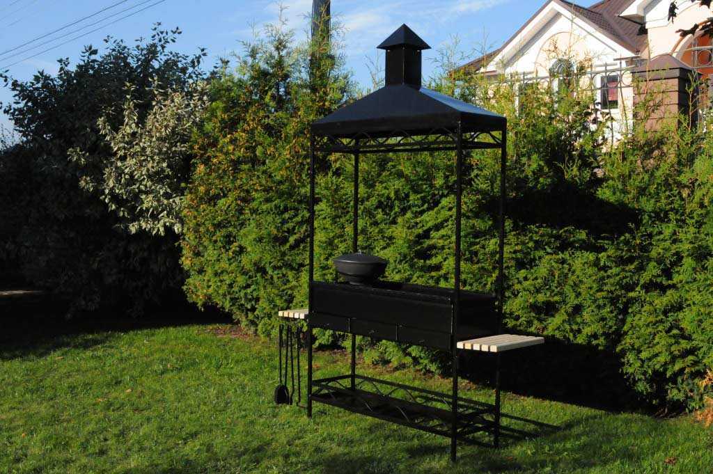 Большим спросом пользуются оригинальные кованые мангалы с крышей. Подобные устройства позволяют не только наслаждаться вкусной едой на свежем воздухе, но и великолепно вписываются в любой загородный интерьер. Кованые конструкции относятся к средней ценовой категории и вполне доступны большинству потребителей.