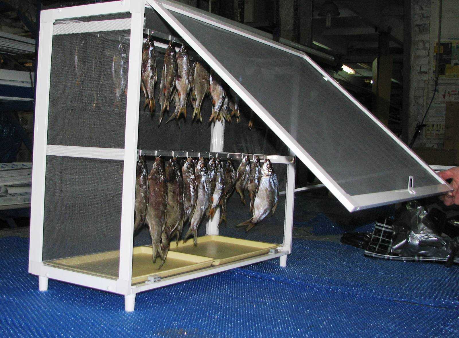 - Рыба нанизывается на прутки через глаза или цепляется на крючки и вывешивается на штанги. Затем контейнер закрывается крышкой, включается вентилятор, ящик помещается в любое удобное место на несколько суток.