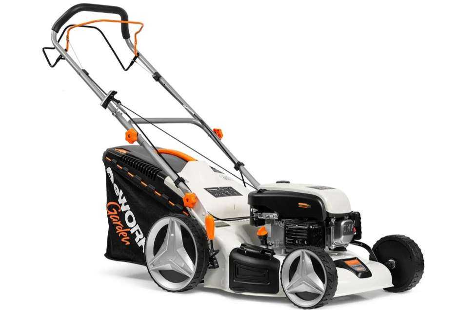 Следующая в нашем топе бензиновая газонокосилка DeWORKS L 50SP. Высота скашивания, как и у большинства газонокосилок, от 25 до 75 мм. Четыре режима работы: собирает траву в травосборник (объем 65 литров), мульчирует, выбрасывает скошенную траву назад или вправо. Из-за своих больших в диаметре колес, данная газонокосилка может легко проходить любые неровности на поверхности лужайки. Данная модель оснащена двумя ножами: основным и турбо — ножом для ускоренного кошения. Ширина скашивания при этом составляет 48см.