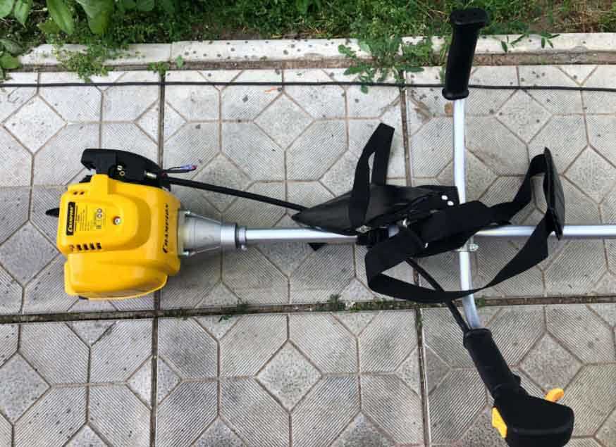 Главная особенность – разборная конструкция. Для решения этой задачи установлен гибкий приводной вал. Подача корда полуавтоматическая, рычаги управления вынесены на рукоятку велосипедного типа, которую можно настроить под пользователя. Антивибрационная демпфирующая система снижает физическую утомляемость, нагрузку на кисти. Для переноски используется наплечный ремень.