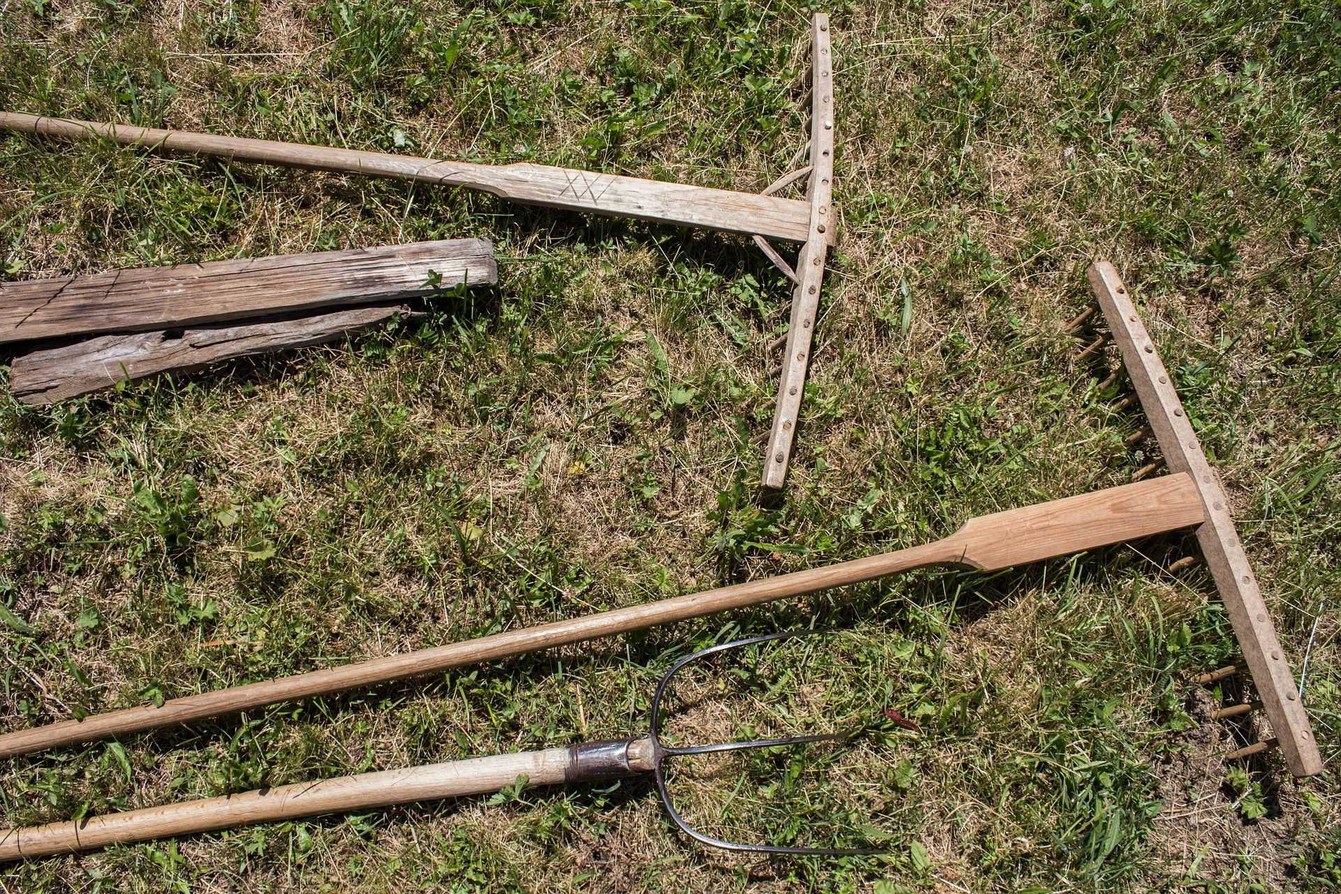 - Деревянные. Инструменты выделяются острыми зубьями. Используются для разбивания крупных комьев грунта, выравнивания почвенного покрова. Обычно с широкой гребёнкой, не слишком тяжёлые.