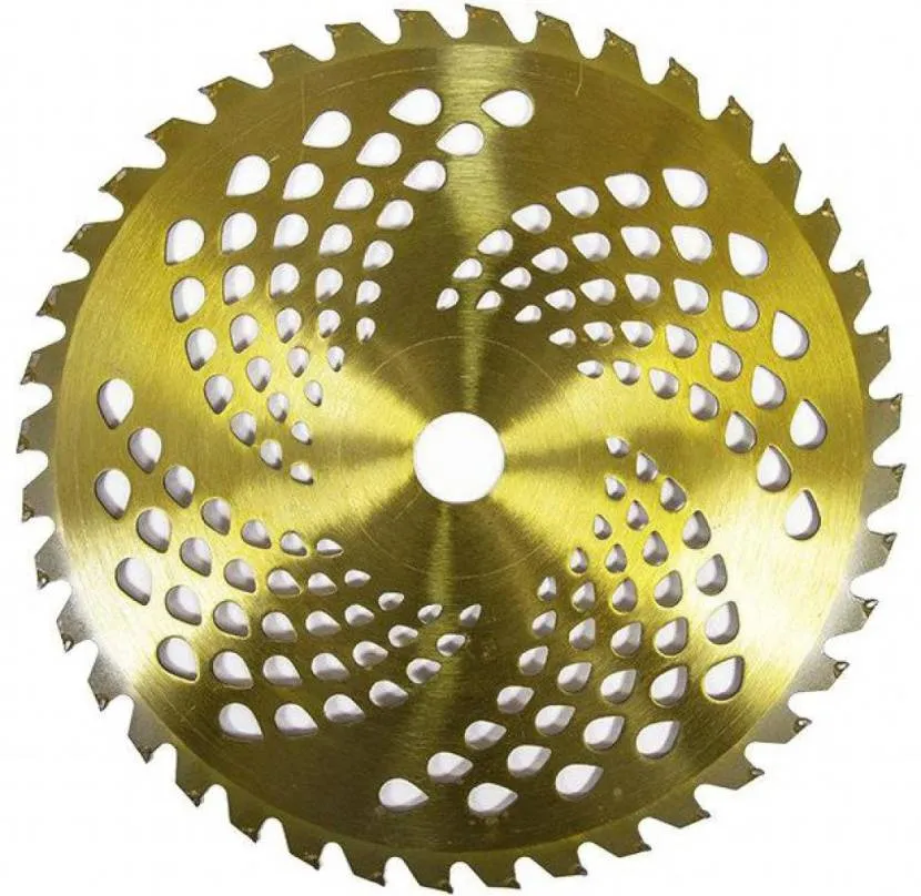 • Дисковый нож. Диск, усеянный мелкими острыми зубьями, изготавливается из металла с твердосплавными напайками. Количество зубьев колеблется в пределах 40-80 штук; чем их больше, тем эффективнее инструмент справляется с укосом самой разной растительности, от бурьяна до мелких деревьев.