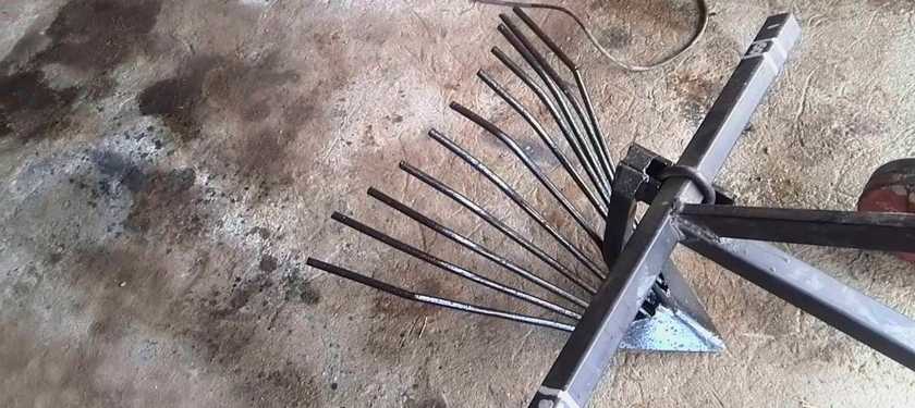 Для изготовления простой модели веерного типа особые материалы, сложные чертежи и замеры не нужны. Основу устройства можно сделать из обыкновенной старой лопаты, прутья — из арматуры или зубьев садовых вил.