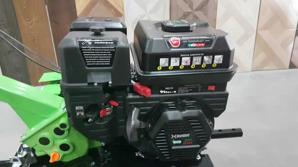 Рабочий объем двигателя составляет 208 кубических см. Для работы мотоблока используется бензиновое топливо марки АИ-82 и моторное масло 10W-30.