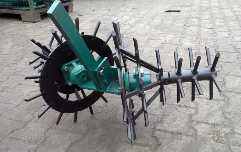 С целью выполнения поставленной задачи применяются трубы и втулки. Далее агрегат на минитрактор оснащается колесами, которые крепятся к раме конструкции.