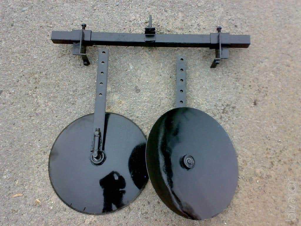 Нижние части дисков раздвигаются на расстояние от 40 до 70 см, в зависимости от ширины заданного ряда. Кроме того, при настройке ширины необходимо следить и за углом наклона — регулируемые части должны быть абсолютно симметричны. Далее агрегат устанавливают на участок таким образом, чтобы борозда проходила ровно между дисками. Проход осуществляется по междурядью, не задевая растения.