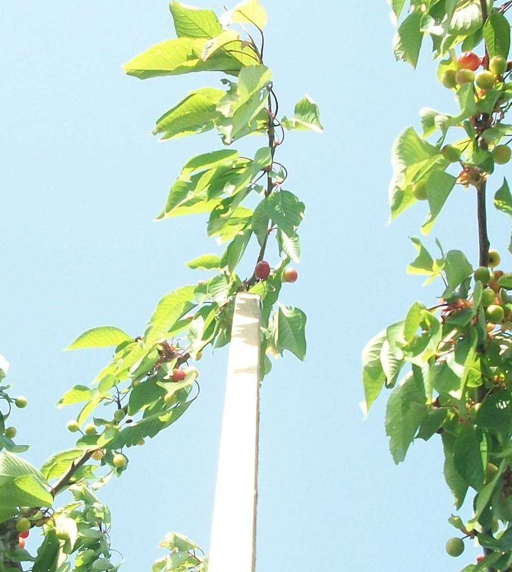 В этом году я решил нарушить сложившуюся традицию и лично присутствовать при созревании черешни. Как выяснилось, черешня начинает поспевать на самом верху дерева, там где ягоды лучше всего освещены в течение дня, а может и по каким другим причинам — не знаю, я не ботаник (и вроде они не ягоды называются, но как их по другому назвать — тоже не знаю). А так как никаких особых лестниц, подмостей или других хитрых приспособлений для обрыва черешни с самого верха дерева на даче нет, желания лазить по деревьям тоже нет уже лет 30, то я задумался над тем, как же мне оборвать поспевающие ягоды черешни.
