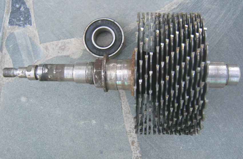 - Сбор режущего механизма. Ножи помещаются на вал, между ними прокладываются шайбы для того, чтобы исключить трение режущих элементов друг о друга. С обоих сторон вала ножи закрепляются гайками.