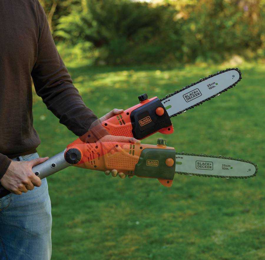 На конце штанги, имеется специальная шина с цепью, которая и является режущим инструментом. Шины могут иметь разную длину, чем длиннее, тем большего диаметра ветку можно перепилить.