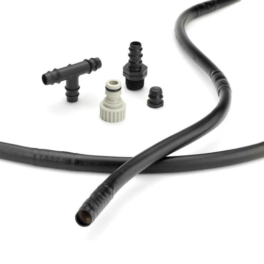 Следующий шаг – купить шланг для капельного полива. Используется, жесткая ПВХ труба большого диаметра, в которую надо врезать специальные переходники, подключая к ним шланги или ленты для капельного полива. Как более простой вариант – обычный армированный садовый шланг, к которому с помощью тройников подключаются поливающие трубки.