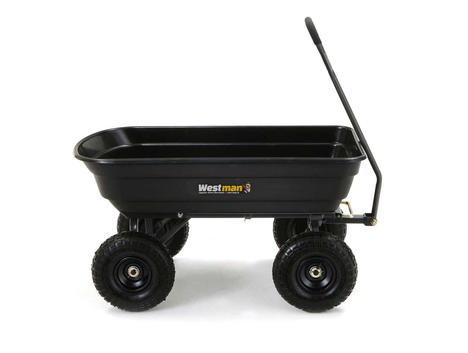 Тележка четырехколесная для дачи Westman 250 имеет функцию самосвала. При нажатии на специальную ручку задняя ось проезжает вперед, тем самым наклоняя кузов. Выгрузив содержимое, кузов сам защелкивается на прежнее место.