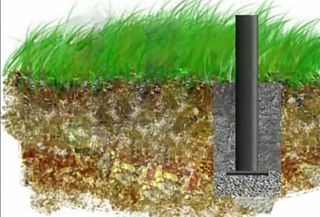 Уплотнение штыря выполняется двумя способами – заливкой бетона и засыпанием щебня. Во втором случае следует углублять штырь на 200 мм в почву