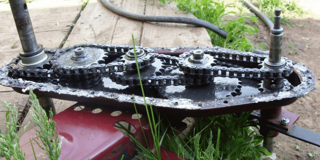 По сравнению с червячным редуктором, шестеренчато-цепной обладает большей надежностью. Он удобен и прост в эксплуатации, может поддерживать функцию реверса. Как правило, это разборная конструкция, где все элементы соединены между собой болтами, благодаря которым можно осматривать состояние цепей и шестеренок при необходимости. Подобные редукторы устанавливают на большие мотоблоки, которым необходим прочный и надежный агрегат для передачи усилия на колеса и фрезы.