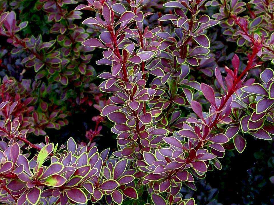 Пестролистый чрезвычайно декоративный барбарис Тунберга Арлекин имеет высоту порядка полутора метров. Диаметр же взрослого куста составляет около 2 метров. Каждый год растение дает прирост до 15 см. При этом молодые побеги с корой желтоватого или красноватого оттенка покрывают мелкие, не более 3 см в длину, удивительные пестрые розово-бордовые листья.