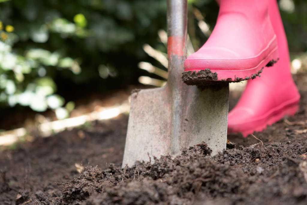 Важно сделать это за пару недель до посадки. Размеры лунки — в 2 раза больше размера корневища: