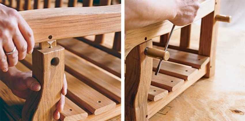 Деревянные качели-скамья, шаг 5: крепление подлокотников.