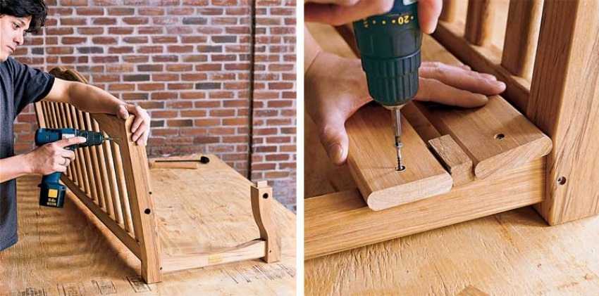 Деревянные качели-скамья, шаг 4: монтаж спинки и сиденья конструкции.