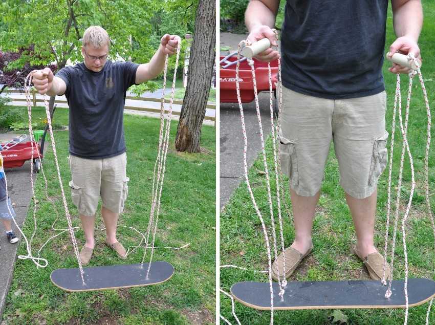 Детские качели из скейтборда, шаг 4: протягивание веревки в отверстия доски и брусков-подлокотников.